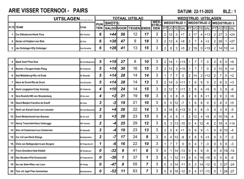 Vandaag hebben jullie het Arie Visser toernooi gespeeld. Ik heb vernomen dat er mooie wedstrijden zijn gespeeld. Helaas moest Han van Papendrecht de wedstrijd verlaten vanwege ziekte. Hoop dat ie snel opknapt. Hierdoor kregen Thea en Sjaak een Bye.